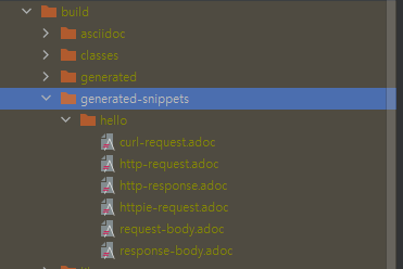 테스트에 성공하면 build/generated-snippets에 .adoc 파일들이 생기는 걸 볼 수 있다.