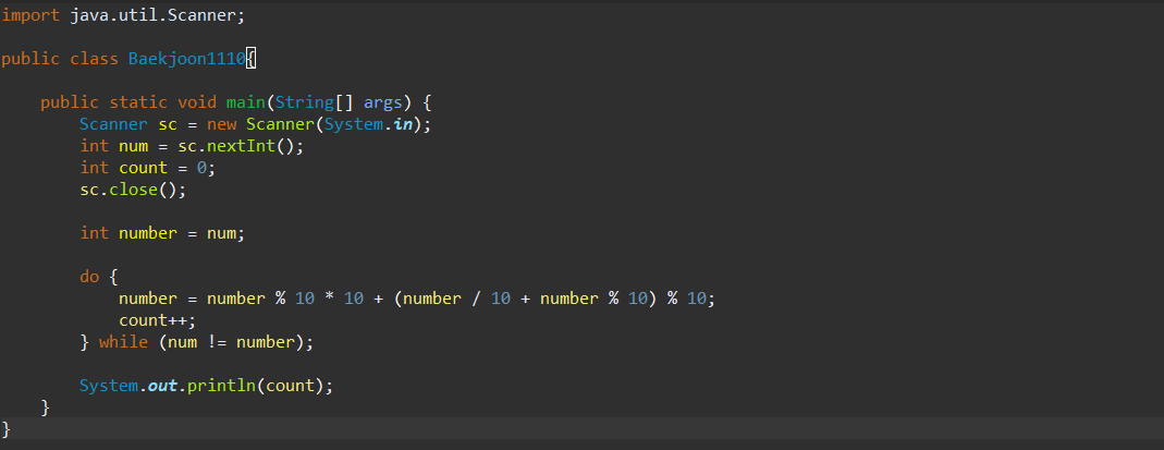 처음에는 일의 자리 숫자 십의 자리 숫자를 입력받은 숫자를 변수 두개에 할당한 후 각 자리 수를 비교하는 방법으로 하려고 했지만 효율성이 떨어졌다. 그래서 일의 자리, 십의 자리를 비교하는 것이 아니라 덧셈을 마치고 숫자 변환을 number 변수에 다시 할당한 후 num과 비교하는 방법을 써서 간편하게 결과를 출력해낼 수 있었다.