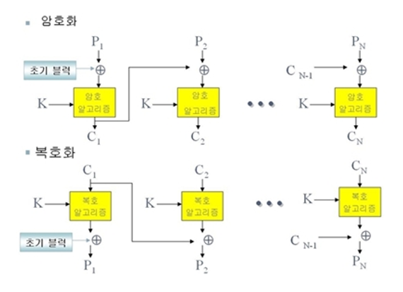 • +같은 평문 blk라도 다른 암호문 blk 생성 -> xor 단계를 거치기 때문 -> 보안성 좋음