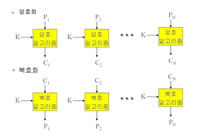 • 긴 평문을 일정한 길이의 블록으로 나누어 블록단위로 암호화하는 방식