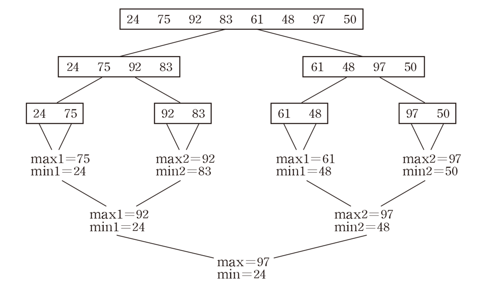 3. 2에서 찾은 두 개의 최댓값들과 두 개의 최솟값들을 비교하여 전체 배열의 최댓값과 최솟값을 구한다.