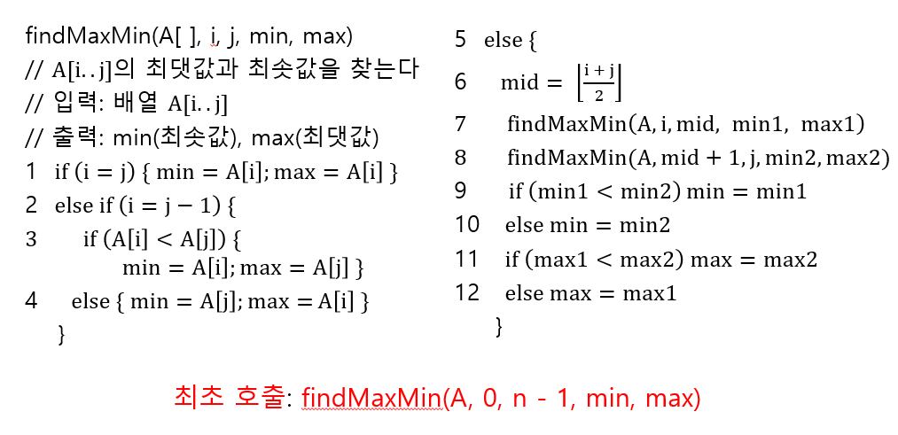 문제: 크기가 n인 배열내의 요소들 중 최댓값과 최솟값을 찾는다.