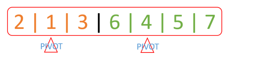 결과적으로, 6을 기준으로 6보다 작은 값은 왼쪽, 큰 값은 오른쪽에 위치한다. 그 다음에 그림에서 보듯이 각 나누어진 배열에서 또 pivot을 정하고 위 설명 과정을 반복하면 전체적으로 오름차순 정렬이 된다.