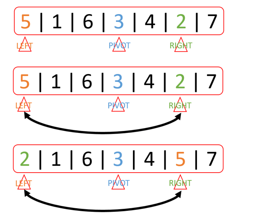 left는 pivot보다 큰 수를 만나면, right는 pivot보다 작은 수를 만나면 대기한 뒤 서로 교환한다.