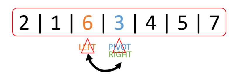 이렇게 left와 right가 움직이다가 left가 right 오른쪽에 위치하면 그만둔다. 단, pivot넘어서 까지 가지 않는다.