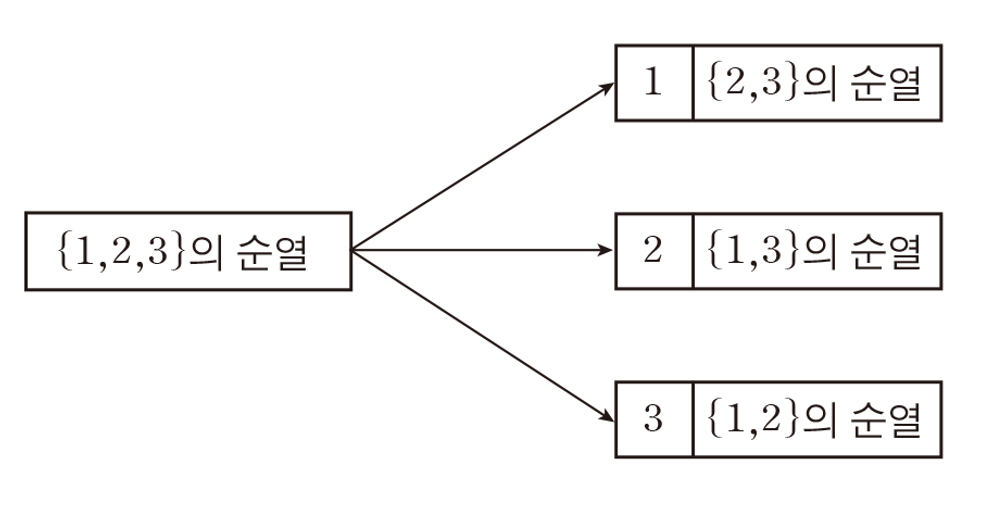 배열의 첫 번째, 두 번째와 세 번째 요소를 각각 첫 번째 요소와 교환한 후 배열의 나머지 부분에 대해 순열을 생성하는 일을 재귀적으로 반복한다.