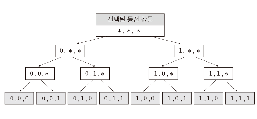 - 3개의 동전들을 던질 때, 나올 수 있는 값들의 모든 가능한 조합들을 출력하는 문제