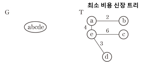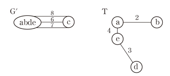 4. 남은 간선들 중 (a, e)와 (b, e)가 가중치가 가장 작으므로 임의로 (a, e)를 선택하여 T에 추가하고 그래프의 정점 ab와 de를 합친다.
