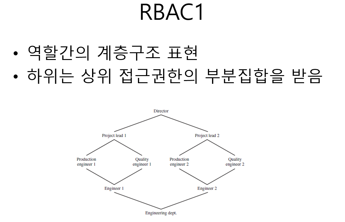 ● RBAC2는 RBAC1 + 상호 배타적 역할 + 역할 개수 + 필요 조건등 제약사항 (EX, 팀장은 개발 역량을 갖춰야 한다)