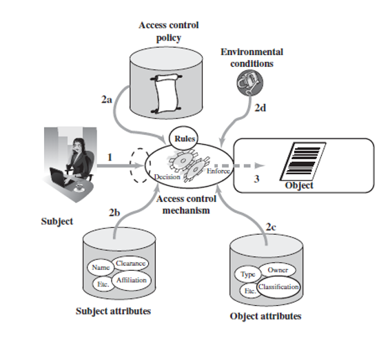 ② 매커니즘은 접근 제어 정책이 정의하는 규칙에 기반하여(2a) 주체(2b), 객체(2c), 환경 조건(2d)의 속성에 접근하여 허가를 결정