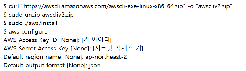 ■ Lightsail에서 S3로 파일을 업로드 해보자. 먼저 aws-cli를 설치해야 한다. aws configure 명령어를 입력한 후에 키 파일 정보들을 입력한다.