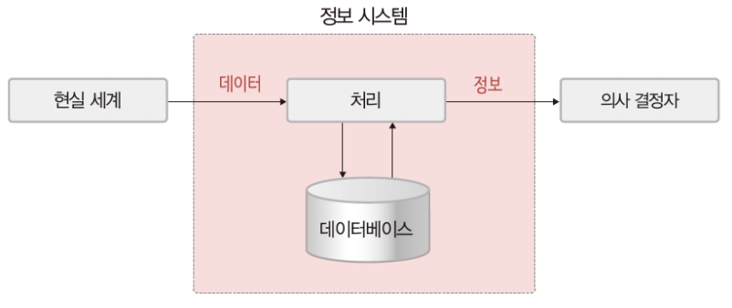 > 여기서 데이터베이스가 정보 시스템 안에서 데이터를 저장하고 있다가 필요할 때 제공하는 역할을 담당한다.