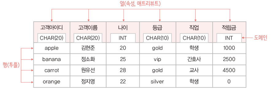 ex) 고객(고객 아이디, 고객 이름, 나이, 등급, 직업)