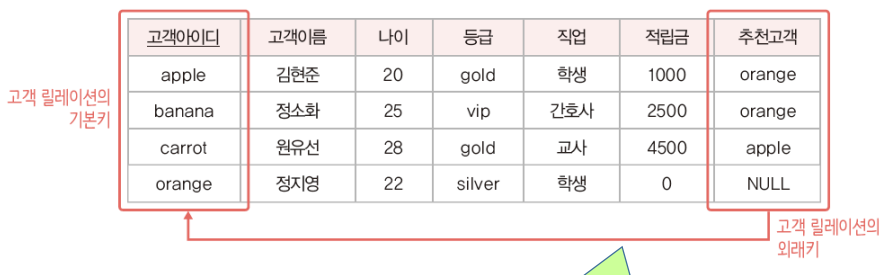 ex) 고객 릴레이션의 기본키: 고객 아이디