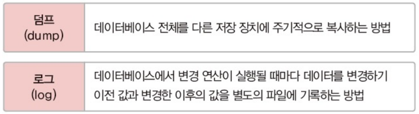 - 덤프(복사본)이용 : 전체 데이터베이스의 내용을 일정 주기마다 다른 안전한 저장 장치에 복사