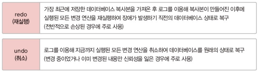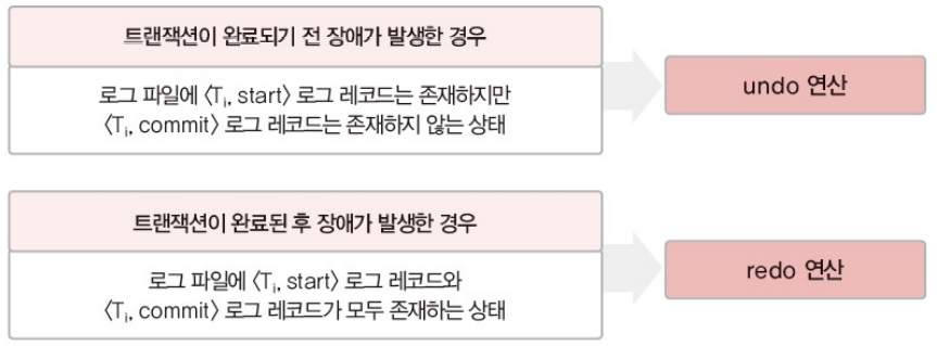 - 장애 발생 시점에 따라 redo나 undo 연산을 실행해 데이터베이스를 복구