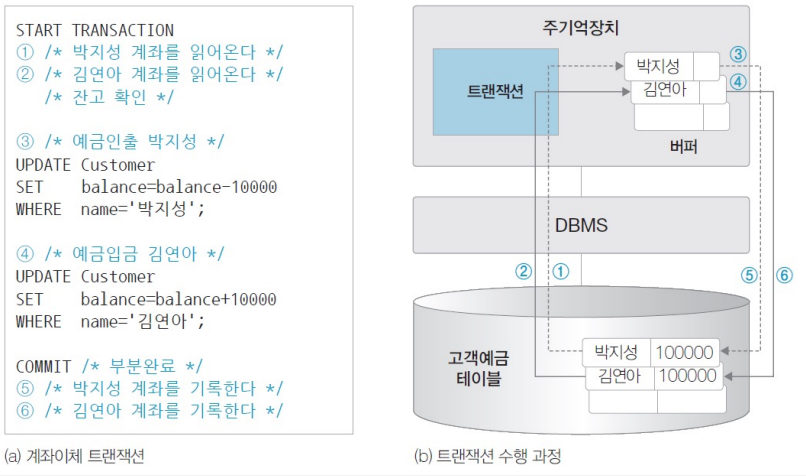 - 박지성 계좌와 김연아 계좌의 값을 하드디스크(데이터베이스)에서 주기억장치 버퍼로 읽어온다.
