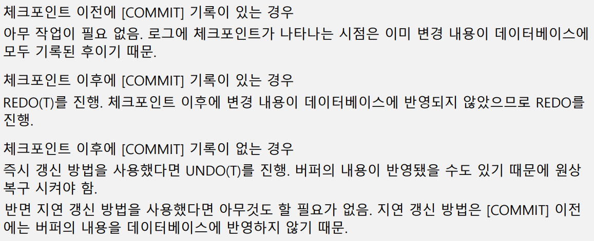 - 체크포인트가 있으면 로그를 이용한 회복 기법은 좀 더 간단해진다.