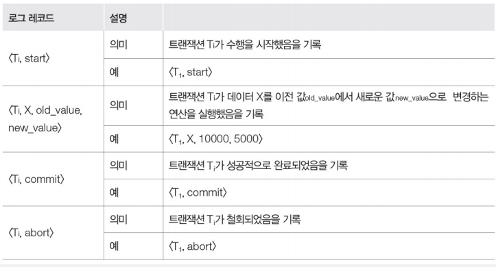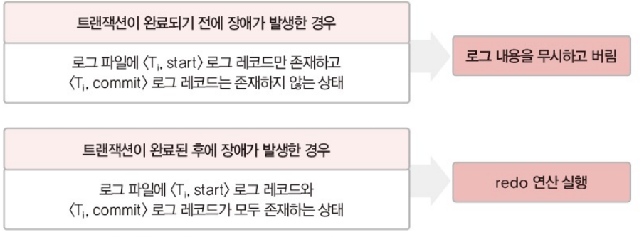 - 트랜잭션 수행 중에 장애가 발생할 경우 로그에 기록된 내용을 버리기만 하면 데이터베이스가 원래 상태를 그대로 유지하게 된다.