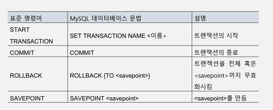 | 트랜잭션 장애 | 의미 | 트랜잭션 수행 중 오류가 발생하여 정상적으로 수행을 계속할 수 없는 상태 |