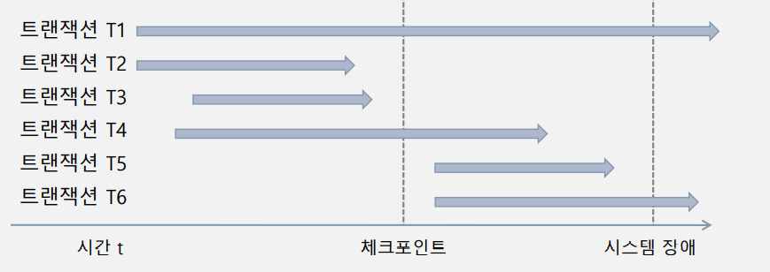 - 로그를 이용한 회복은 시스템 장애가 일어났을 때 어느 시점까지 되돌아가야 하는지 알 수 없다. 트랜잭션이 많은 응용의 경우 하루 이상 되돌아가서 복구하는 것은 사실상 불가능하다.