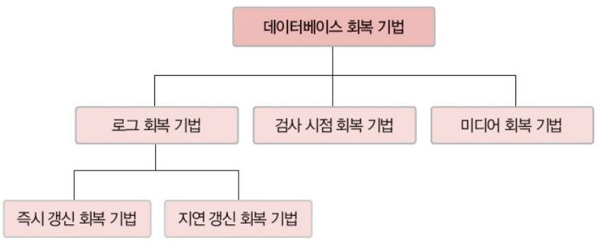 | 미디어 장애 | 의미 | 디스크 장치의 결함으로 디스크에 저장된 데이터베이스의 일부 혹은 전체가 손상된 상태 |