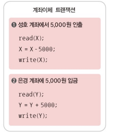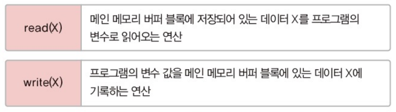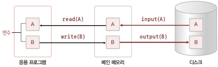 - 응용 프로그램에서 트랜잭션의 수행을 지시하면 메인 메모리 버퍼 블록에 있는 데이터를 프로그램의 변수로 가져오고, 데이터 처리 결과를 저장한 변수 값을 메인 메모리 버퍼 블록으로 옮기는 작업이 필요하다.