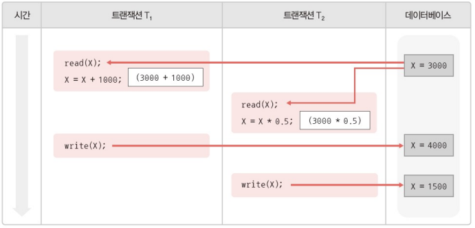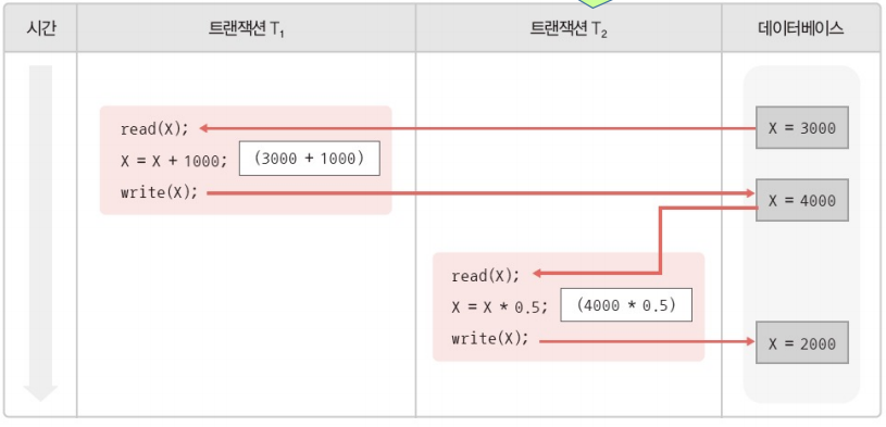 위 그림처럼 트랜잭션을 순차적으로 수행해서 갱신 분실이 발생하지 않도록 해야한다.