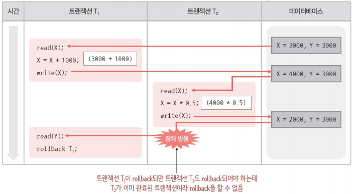 - 트랜잭션이 완료되기 전 장애가 발생하여 rollback 연산을 수행하면, 장애 발생 전에 이 트랜잭션이 변경한 데이터를 가져가서 변경 연산을 실행한 다른 트랜잭션에도 rollback 연산을 연쇄적으로 실행해야 한다는 것이다.