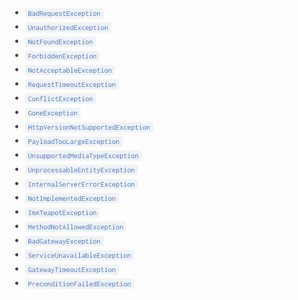 HttpException에서 상속되는 표준 예외 집합을 제공한다. @nestjs/common 패키지에서 노출되며 일반적인 HTTP 예외 중 대부분이 있다.